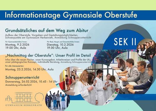 Für die Jahrgangsstufe 9 bzw. 10 und für interessierte Schülerinnen und Schüler anderer Schulformen stellen sich jedes Jahr im Februar bzw. März vor allem die „neuen“, aber auch bekannte Fächer der gymnasialen Oberstufe vor. In Form eines "Fächernachmittags" präsentieren die Fachschaften Inhalte, Anforderungen und Chancen, unterstützt durch Schüler aus älteren Jahrgangsstufen und Leistungskursen. Den aktuellen Termin finden Sie im Jahresterminplan auf unserer Homepage.