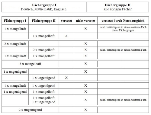 Die nachfolgende Übersicht zeigt einige gängige Fälle zur Frage der Versetzung/ Nachprüfungsmöglichkeiten bei Minderleistungen von den Klassen 7 bis 10. Die Beispiele berücksichtigen die besonderen Versetzungsbestimmungen (§ 27 APO-SI) sowie die Möglichkeit einer Nachprüfung (23 APO-SI). Nachfolgende Übersicht ist nicht abschließend. Im Einzelfall ist es unerlässlich, sich von der Schule beraten zu lassen.